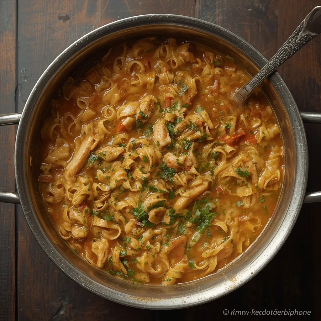 - Remove chicken, shred with two forks, then return to the pot. Stir in noodles and cook until al dente, about 6–8 minutes.